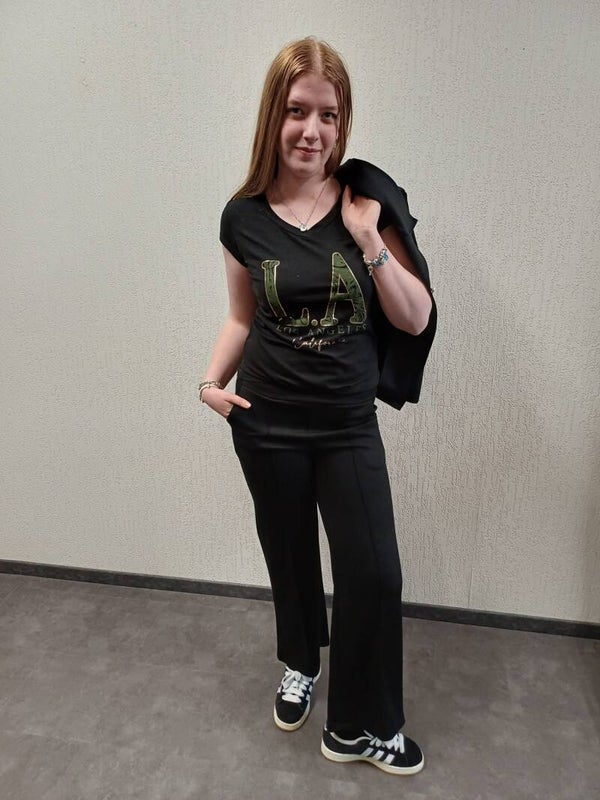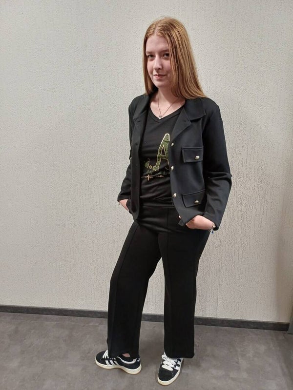 Maat, L/XL vest, oksel tot oksel 54cm, lengte 67cm. Broek maat XL taille 44cm, lengte 107cm